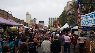 We started at the south end and slowly worked our way north. It was a perfect day to be outdoors, the temperature was in the mid-70s with just enough overcast to make the day pleasant. By mid-afternoon, some of the booths had run out of crowd favorites -- like sweet potato fries -- so we weren't able to sample some of the offerings that we would have liked. Donna and I sampled the wings from a couple of different places, and other places we would have liked to try had very long lines, so we passed on those in favor of some of the less popular choices.